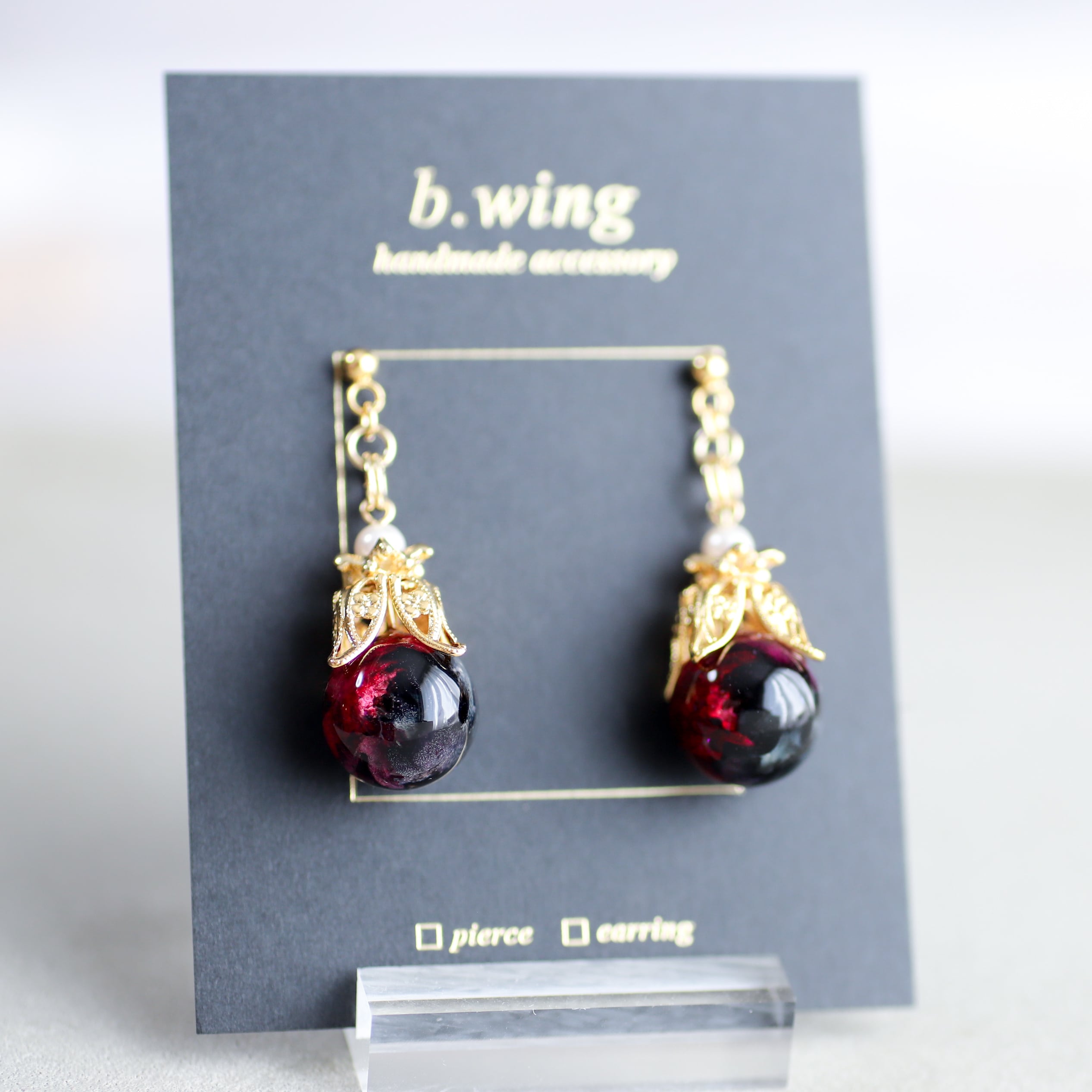 シンプルで、美しい「薔薇玉の耳飾り」。本物のスプレー薔薇を使用し、専用インクで染め上げ、花びらの形、開き方にこだわったデザインです。